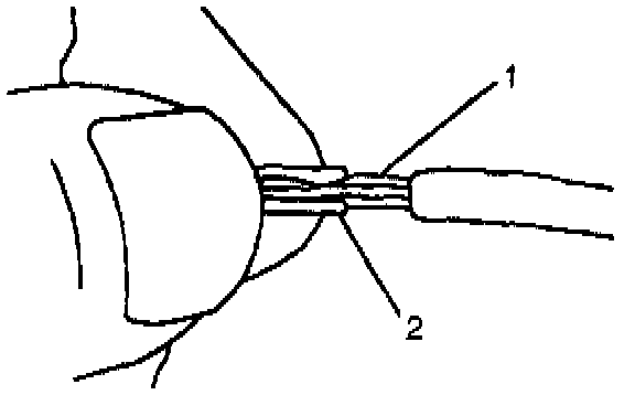 7. Center the splice clip (2) over the stripped wires (1) and hold the clip in place.