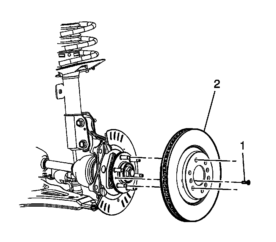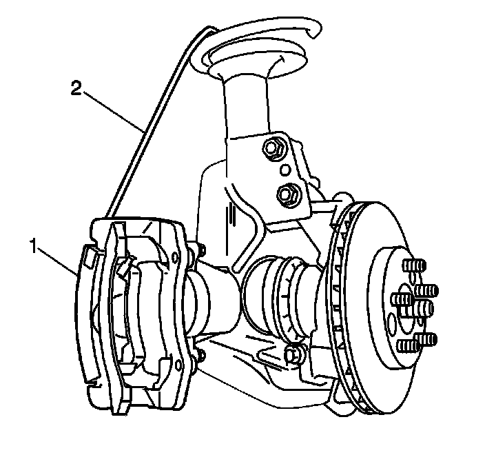 Remove the brake caliper and the caliper mounting bracket as an assembly (1) from the suspension knuckle and support the assembly with heavy mechanic's wire (2), or equivalent. Ensure that there is no tension on the hydraulic brake flexible hose. Refer to Front Brake Caliper Bracket Replacement Front Brake Caliper Bracket Replacement.