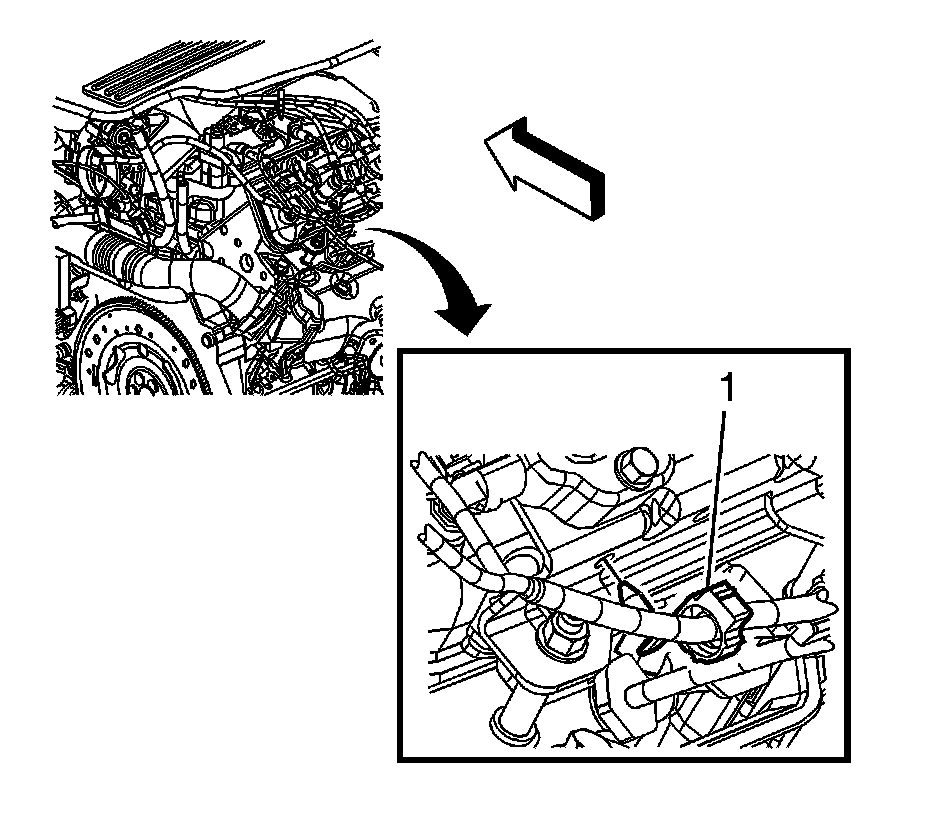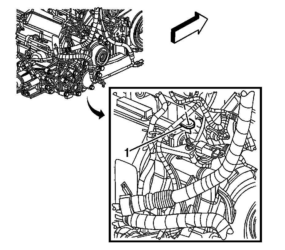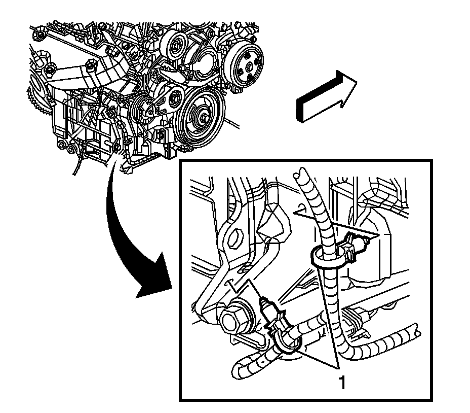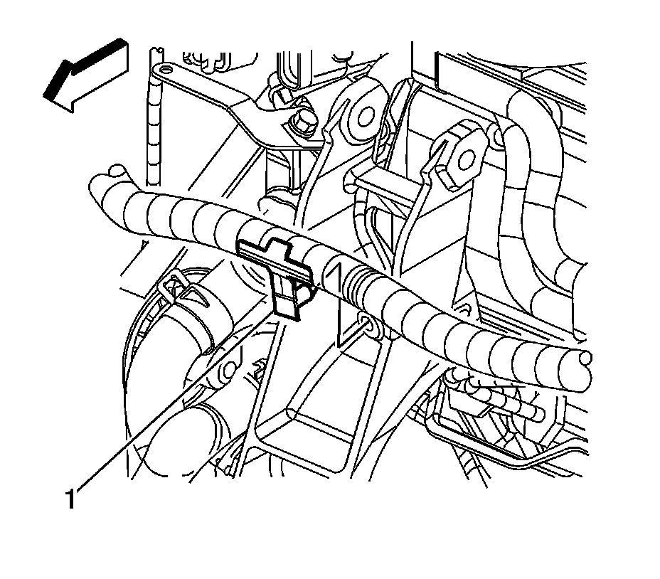 124. Position the coolant recovery reservoir hose clamp (1) at the coolant crossover.