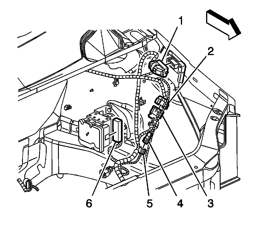 113. Connect the engine harness electrical connector (6) to the ABS module.