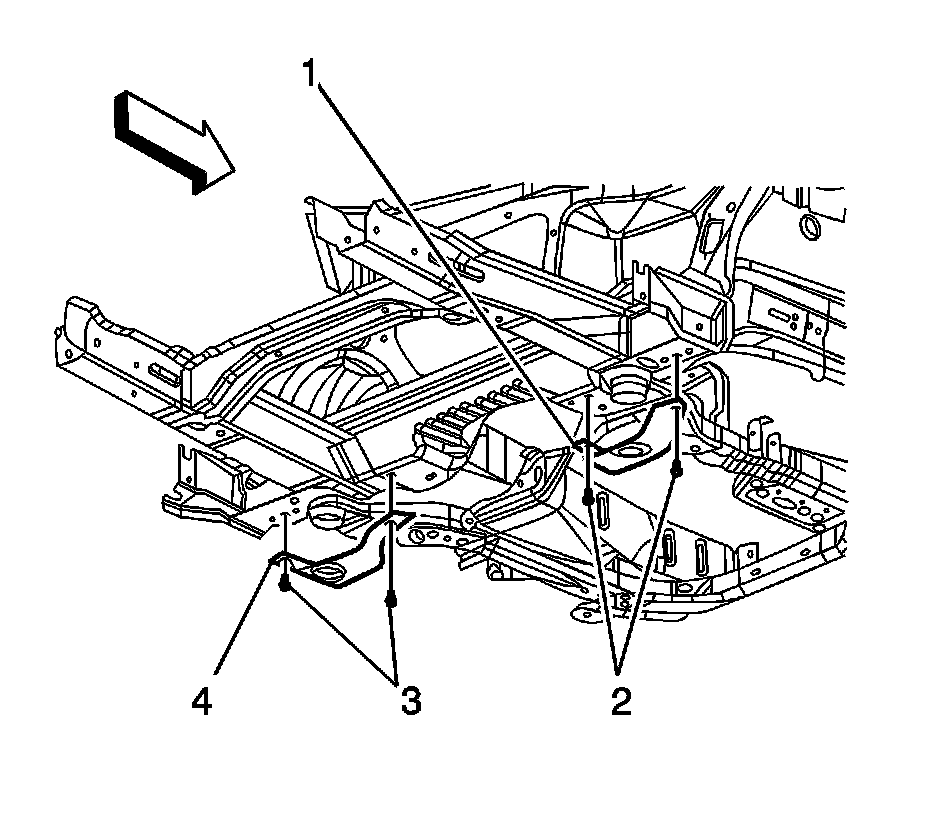 65. Install the frame rear strap bolts (2, 3) and tighten to 50 Nm (37 lb ft).