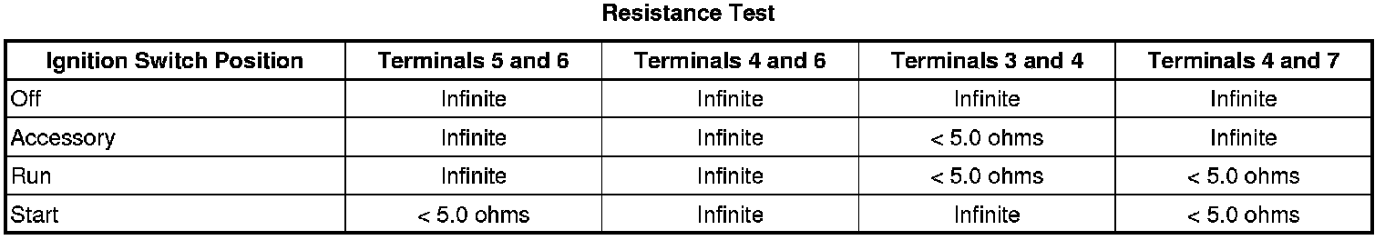 Using the Resistance Test below, check the resistance between the terminals of the ignition switch listed in each switch position listed.