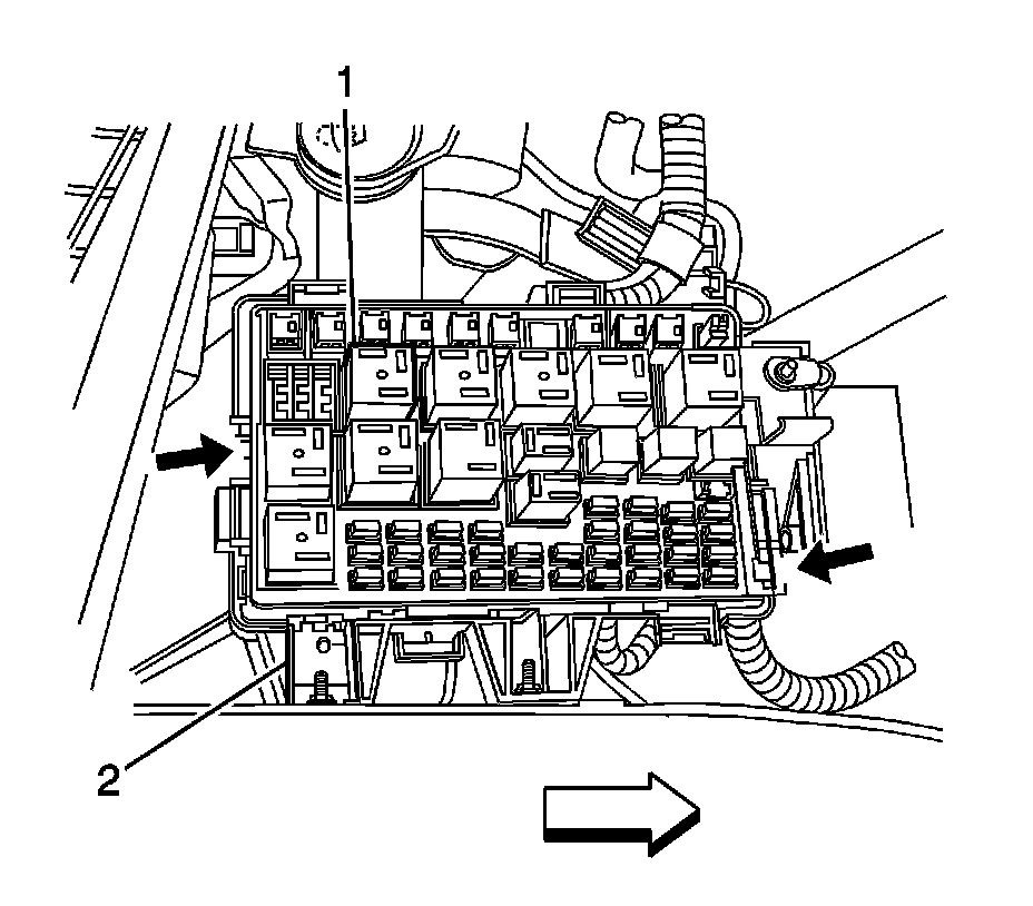 4. Inspect the 2 outer locking tabs to ensure the new underhood accessory wiring junction block assembly is locked into the lower base (2).