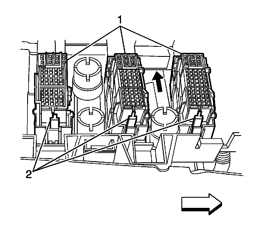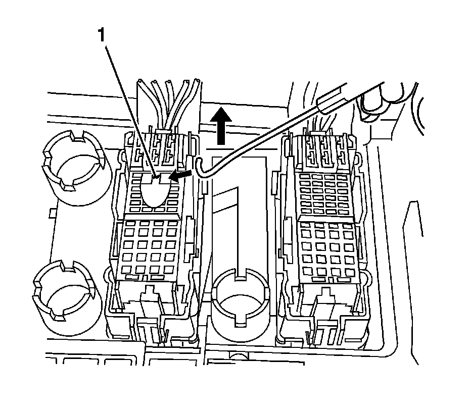 6. Carefully lift at each side of the underhood accessory wiring junction block assembly in order to release the underhood accessory wiring junction block assembly from the 3 main body harness connectors (1) and exposing the lower connectors.