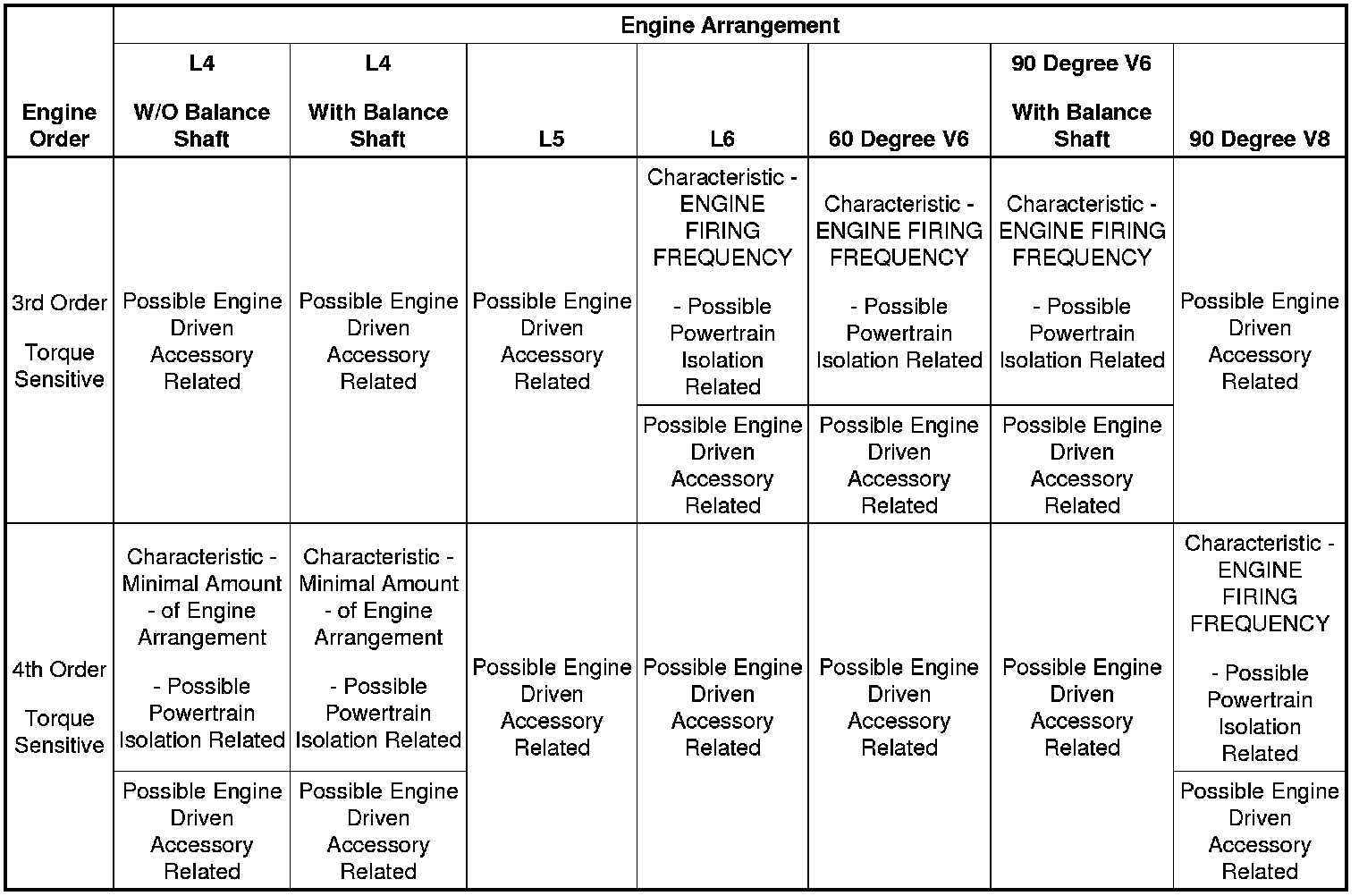 3. If the dominant frequency in Hz, recorded during duplication of the disturbance and the engine firing frequency in Hz, just calculated ARE related, then an engine FIRING FREQUENCY related disturbance is present. Engine firing frequency disturbances are usually related to improper isolation of a component. Refer to the Engine Order Related Disturbances table.
