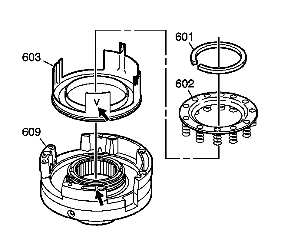 3. Insert the fourth clutch piston assembly (603) into the driven sprocket support (609) and align as shown.