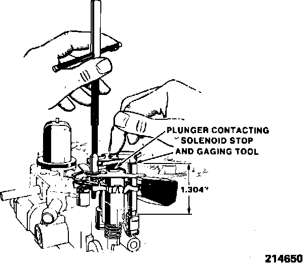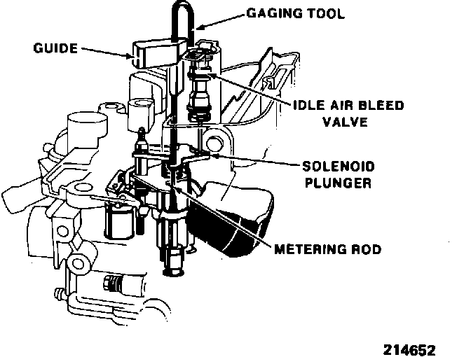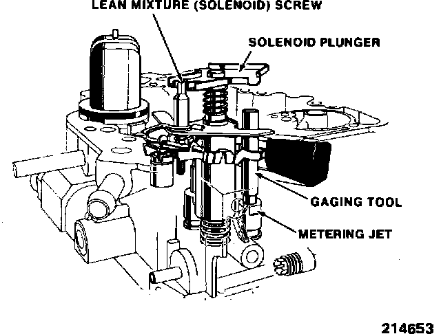 1. Hold the solenoid plunger down, against the solenoid stop or gaging tool, and use tool (J-28696-10, BT-7928) or equivalent, to turn lean mixture screw until the plunger just breaks contact with the gaging tool. Then, turn lean mixture screw slowly until the plunger just contacts the gaging tool. The adjustment is correct when the solenoid plunger contacts both the solenoid stop and the gaging tool (see Figure 2 on the following page)..