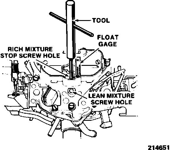 4. Insert external float gage (J-9789-130, BT-7720) or equivalent in vent hole. Use tool (J-28696-10, BT-7928) or equivalent to adjust rich mixture stop screw to obtain 4/32 inch total plunger travel (see Figure 3 on following page).
