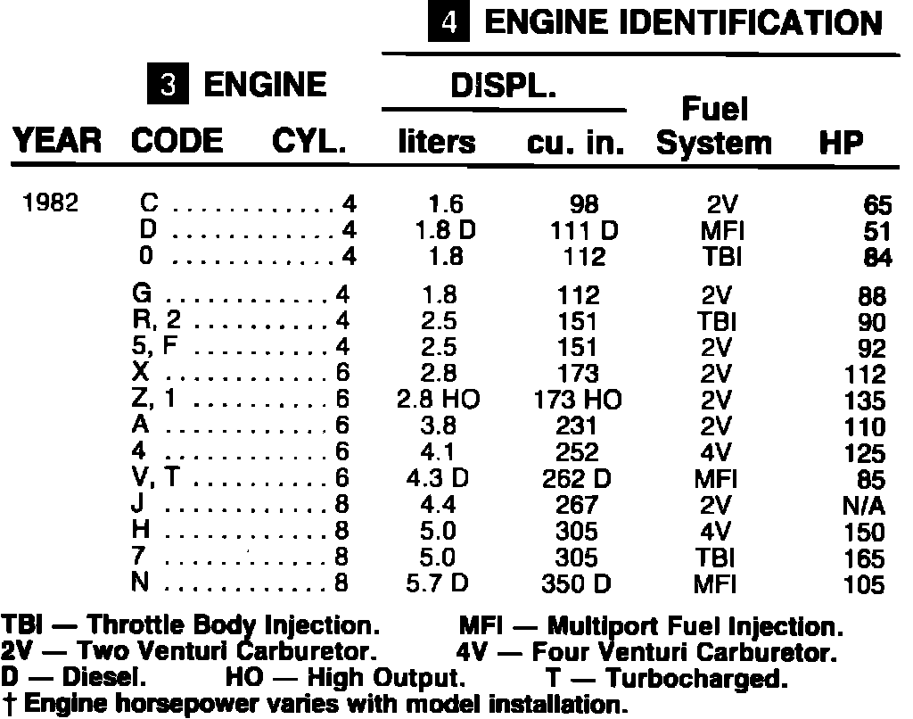4 - ENGINE IDENTIFICATION: On the line where the engine code appears, read to the right to identify the engine.