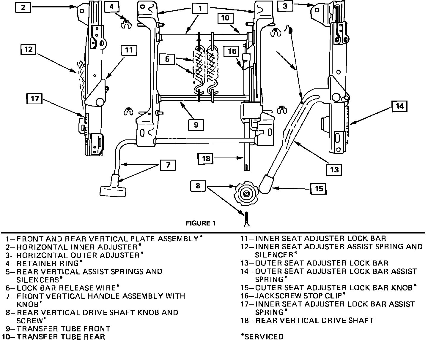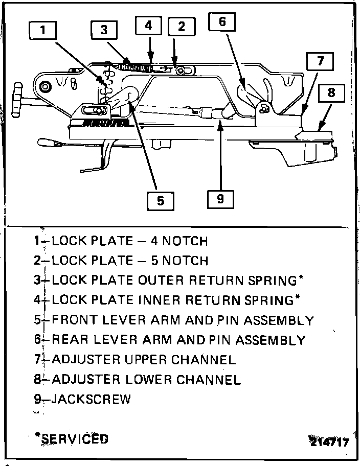 The seat assembly can be disassembled into three (3) major assemblies (inner, outer and vertical adjuster assemblies). To disassemble and assemble the adjuster assembly, follow procedure outlined below.