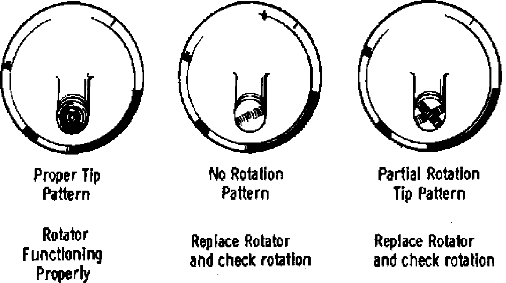 The rotator operates on a Sprag clutch principle utilizing the collapsing action of coil spring to give rotation to the rotor body which turns the valve, Fig. 17. To check rotator action, draw a line across rotator body and down the collar. Operate engine at 1500 rpm, rotator body should move around collar. Rotator action can be in either direction. Replace rotator if no movement is noted. When servicing valves, valve stem tips should be checked for improper wear pattern which could indicate a defective valve rotator, Fig. 19.