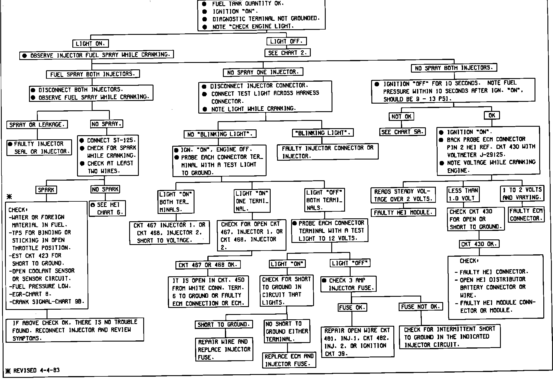 1983 CHART 4AFUEL INJECTION (DUAL INJECTOR)ENGINE CRANKS BUT WILL NOT RUN 5.0L AND 5.7L:
