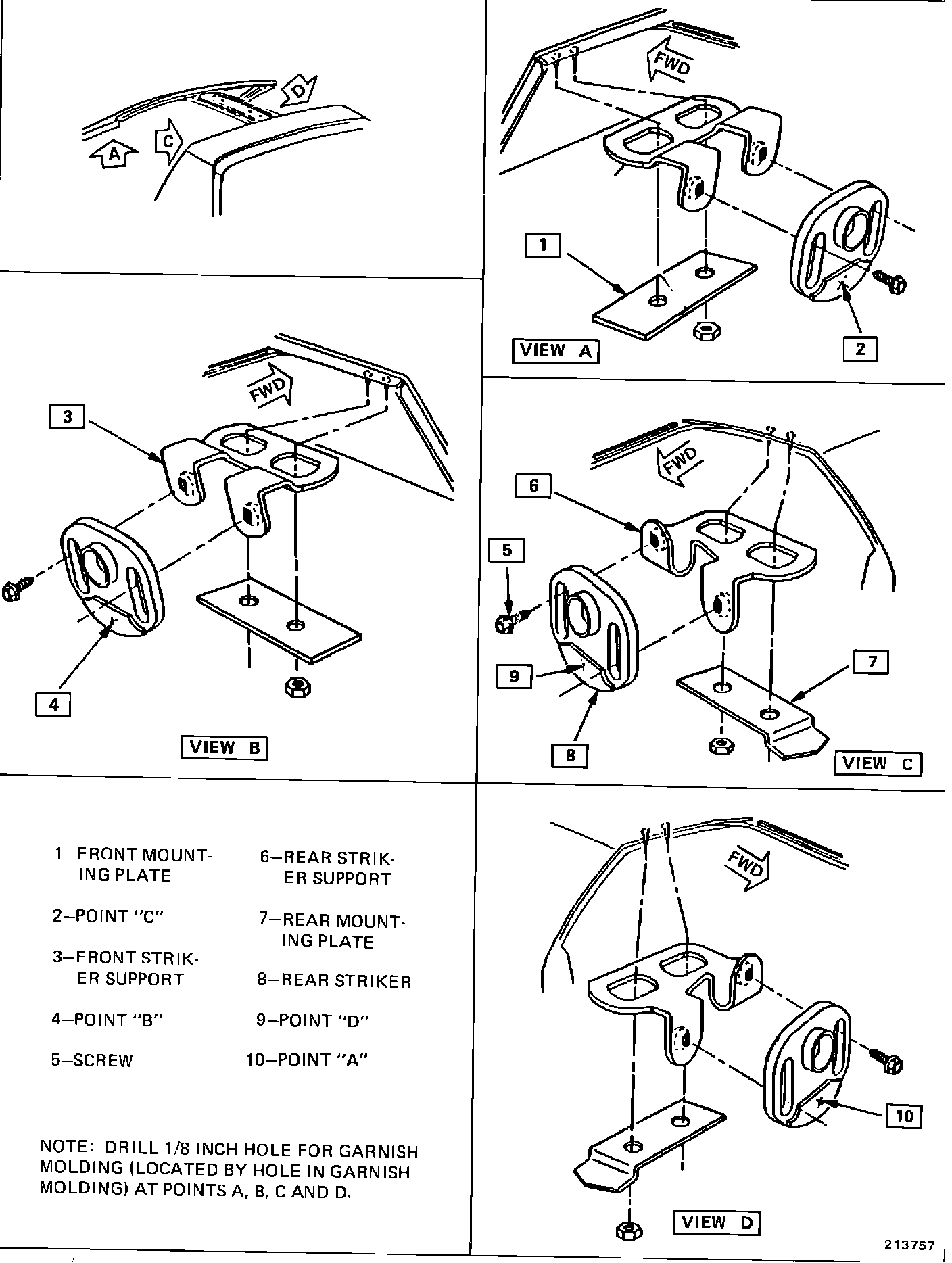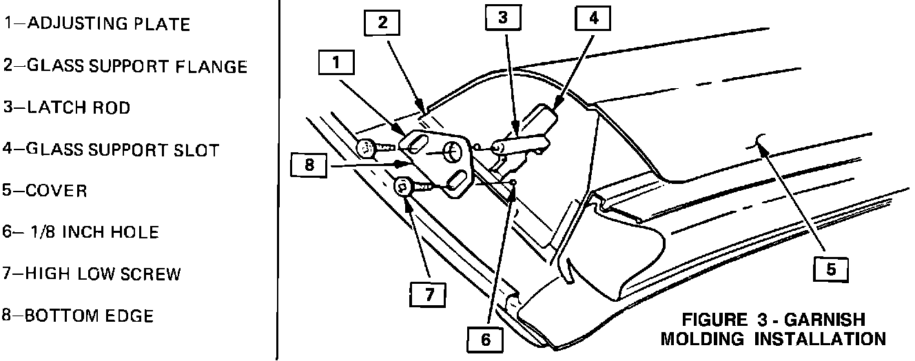 5. With lift-off panel removed, position front and rear opening garnish moldings to body. Using upper garnish molding attached hole(s) as guide, drill 1/8 inch hole through plastic latch strikers. Install garnish molding using high low screw at the upper attachment locations and existing screw(s) at lower locations. For proper adjustments see Figure 3.