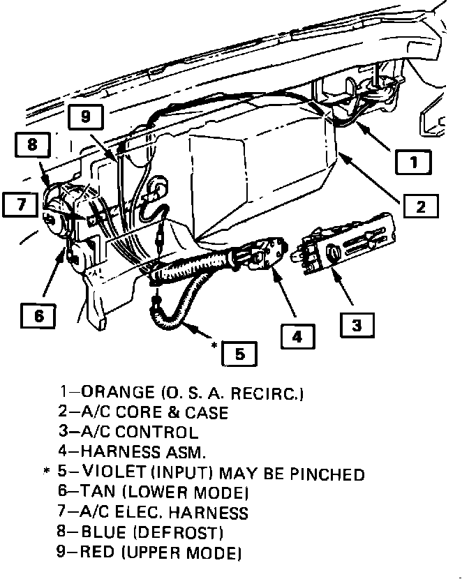 Some 1982-1984 Firebirds may exhibit the condition that air will blow only from the defroster outlets. This condition may be caused by a loss of vacuum to the A/C control or the A/C mode doors. Specifically this condition may be caused by a pinched vacuum harness input (violet) line near the A/C control. To repair this condition, remove kink from the violet line of vacuum harness and re-route to prevent recurrence..