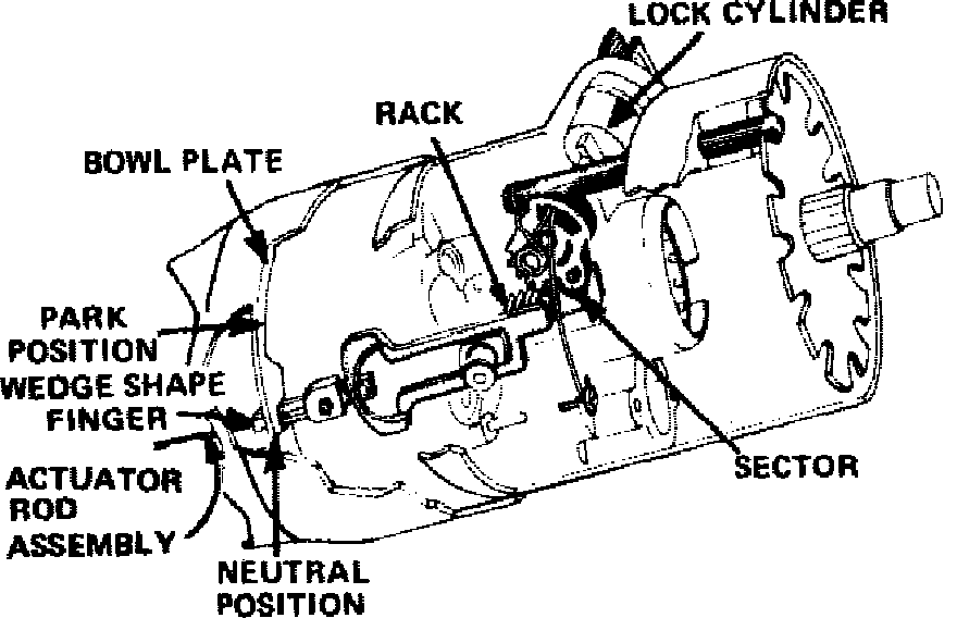 Actuation of the ignition switch is prevented by a mechanical lockout system, Figs. 7 and 8, which prevents the lock cylinder from rotating when the selector lever is out of Park or Neutral. When the selector lever is in Park or Neutral, the slots in the bowl plate and the finger on the actuator rod align allowing the finger to pass through the bowl plate in turn actuating the ignition switch, Fig. 9. If the selector lever is in any position other than Park or Neutral, the finger contacts the bowl plate when the lock cylinder is rotated, thereby preventing full travel of the lock cylinder.