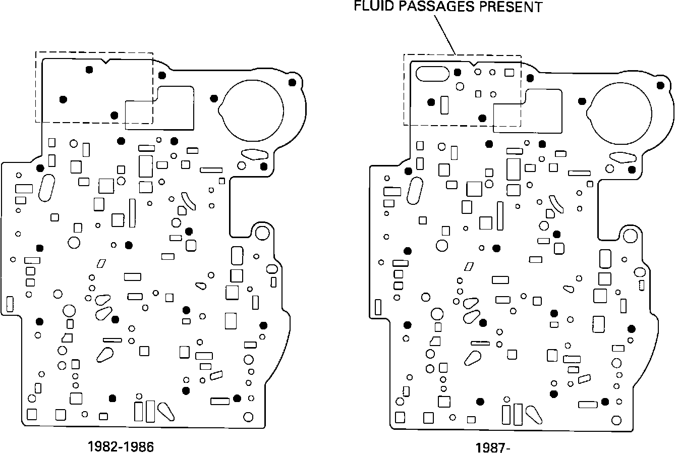 The difference between the two sets of gaskets is the addition of holes in 1987 to accommodate an auxiliary valve body. Transmissions produced Start of Production or after the 1987 model year may or may not have an auxiliary valve body, but 1987-1989 model years must use gaskets with holes for an auxiliary valve body even if an auxiliary valve body is not used.