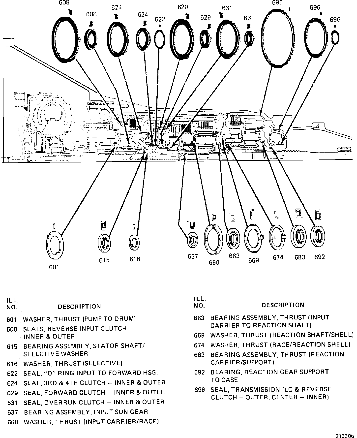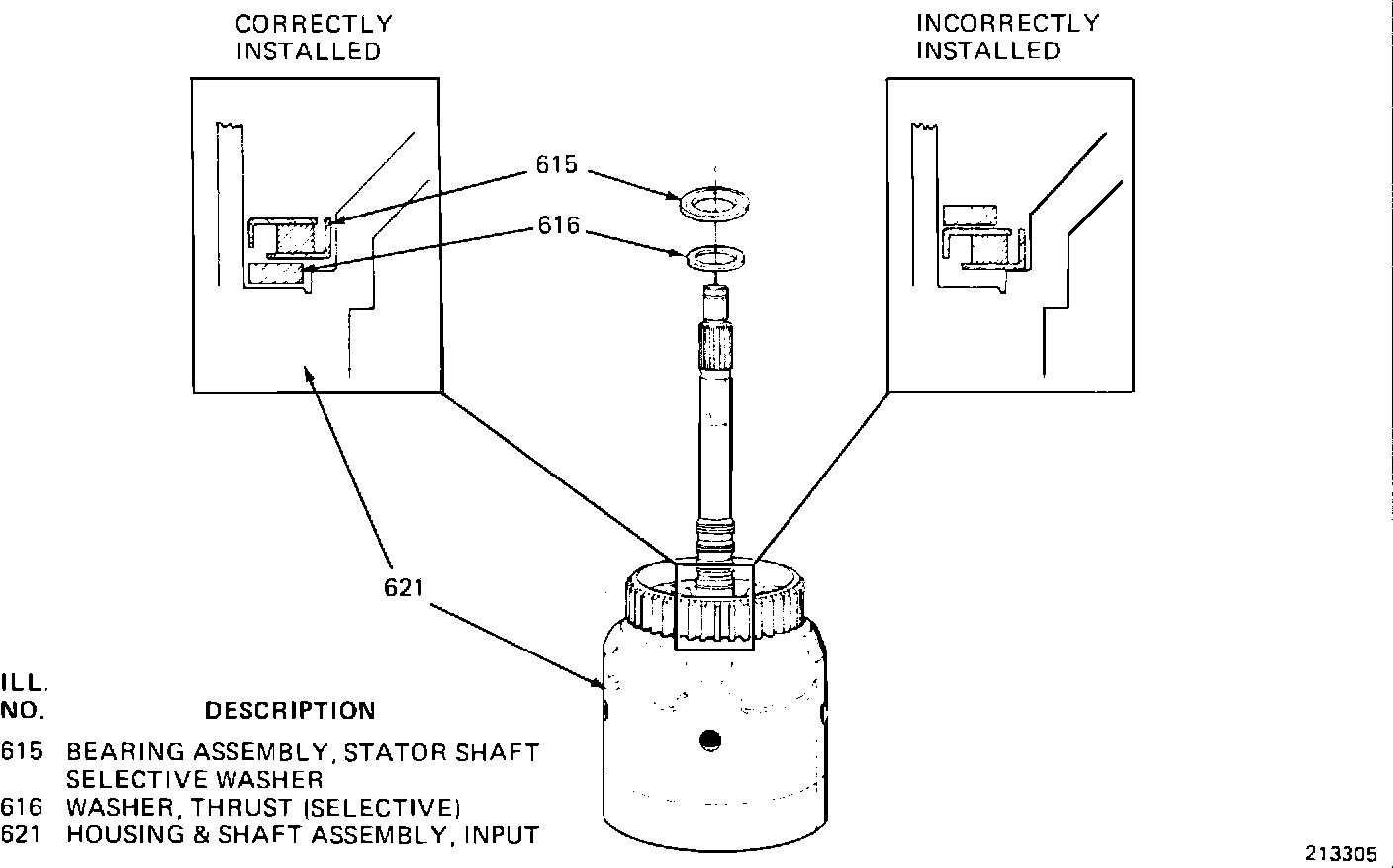 The most common type of misassembly, which affects end play, is either omitting or incorrectly installing bearing assemblies or thrust washers.. If misassembly is suspected, first check for proper installation of the bearing assembly (615) and selective thrust washer (616 shown in Figure 1). Next, check for proper installation of all other bearing assemblies and thrust washers (see Figure 2 shown on the reverse side).