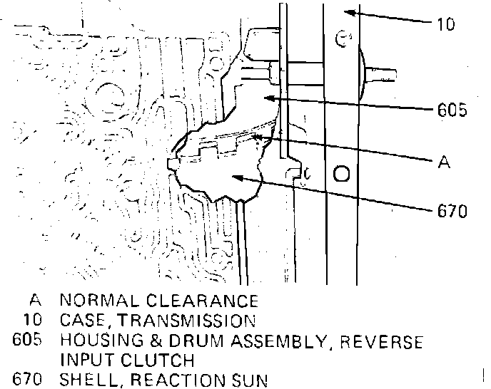 3. When the transmission is properly assembled, there is normal clearance between the reverse input clutch housing and drum assembly (605), and the reaction sun shell (670). This normal clearance (1.121 mm to 3.744 mm) will not affect the transmission end play. This clearance can be observed through the case opening as shown in Figure 3. Do not try to shim this clearance out of the transmission.