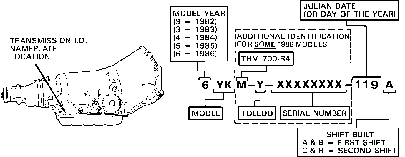 ALL 1986 THM 700-R4 TRANSMISSIONS, BEGINNING APRIL 29, 1986, OR JULIAN DATE 119 (REFER TO FIGURE 1), ARE BUILT USING A NEW PUMP TO CASE BOLT AND O-RING ASSEMBLY. THE NEW BOLT AND O-RING ASSEMBLY IMPROVES SEALING AND BOLT TORQUE RETENTION.