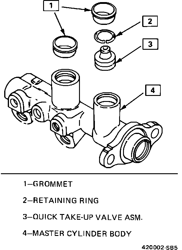 A new master cylinder quick-take-up valve went into production in the above-listed models in December 1983. This new valve eliminates a squeak or whistle-type noise which may occur at the time the brakes are applied. QTU Valve Service Kits which contain a new valve, retaining ring, instruction sheet, and two reservoir grommets, are available from WDDGM for installation as listed below: