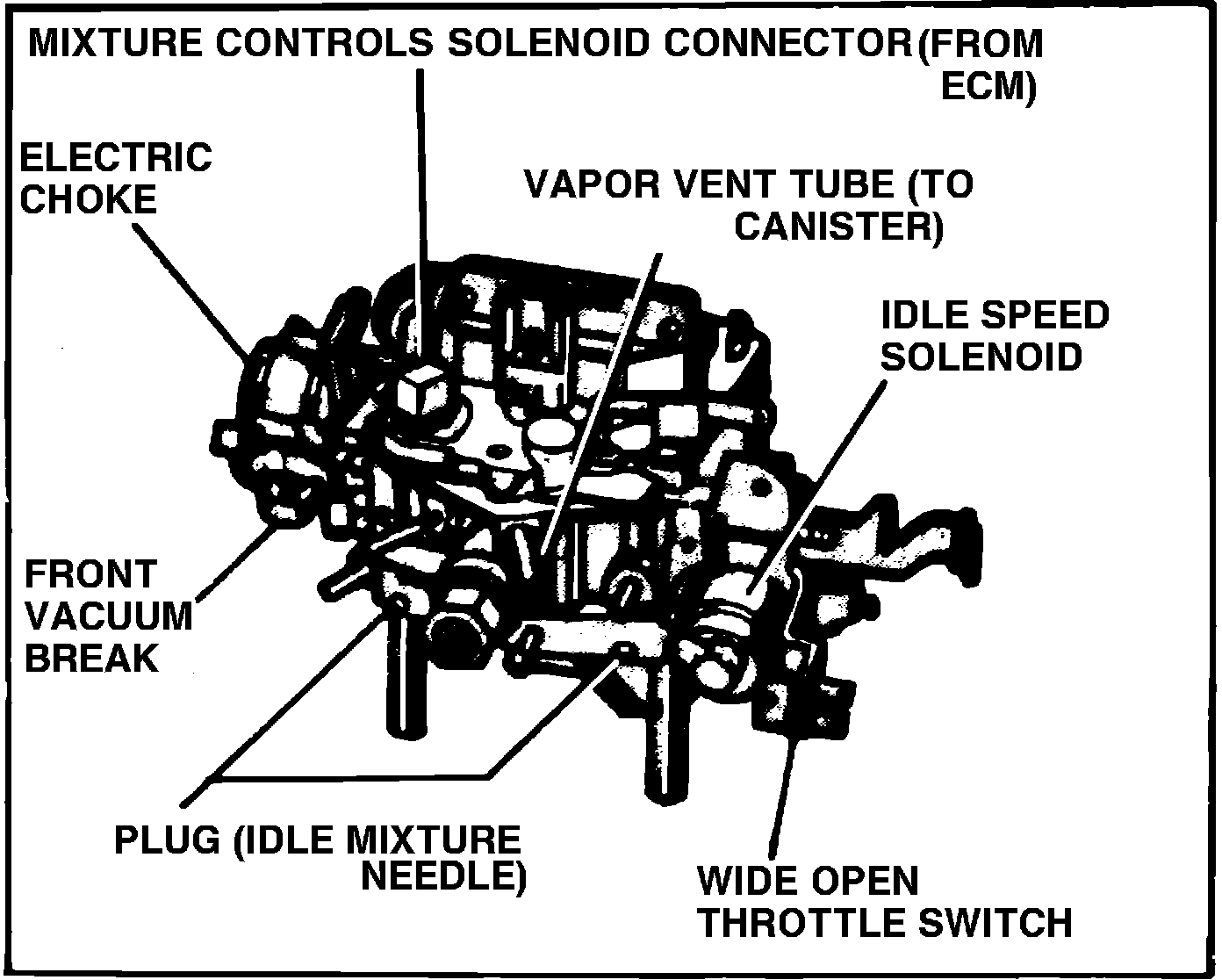 An electrically operated mixture control solenoid, mounted in the fuel bowl, is used to control the fuel-air mixture metered to the idle and main metering systems. Fuel metering is controlled by two stepped metering rods positioned by a plunger in the mixture control solenoid. The solenoid plunger is controlled or ``Pulsed" by an electrical output signal from the Electronic Control Module (ECM). The ECM, responding from a signal from the oxygen sensor, energizes the solenoid, to move the plunger and metering rods to control fuel delivery to the idle and main metering systems. At the same time, air metering to the idle system is controlled by an idle air bleed valve, located in the air horn, which follows movement of the mixture control solenoid plunger to control the amount of air bleed into the idle system to lean or richen the mixture. The movement or ``Cycling" of the solenoid plunger occurs approximately 10 times per second, thereby controlling the fuel-air mixture to achieve optimum mixture ratios. The positioning of the mixture control solenoid in the float bowl, rich stop setting and idle air bleed valve in the air horn are factory adjusted and no attempt should be made to alter these settings except during major carburetor overhaul or when air horn or float bowl replacement is necessary.