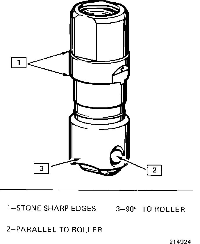 Measure the lifter bore in the block. Any wear not exceeding .003 inches should be satisfactory.. If it is necessary to replace the lifters, stone the sharp edges on the bearing shoulder area of the new lifters as shown in the illustration before installation in the lifter bore.