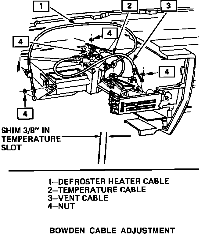 With the temperature lever on the dash control head retained in a position 3/8" from the extreme cold position, (use a 3/8" wide wood or plastic spacer to maintain position and install as shown in figure). Apply sufficient force to the temperature valve lever arm to move the temperature valve into the sealed cold position and reposition the sliding clip on the wire. This will result in a temperature valve seal in both the hot and cold positions.