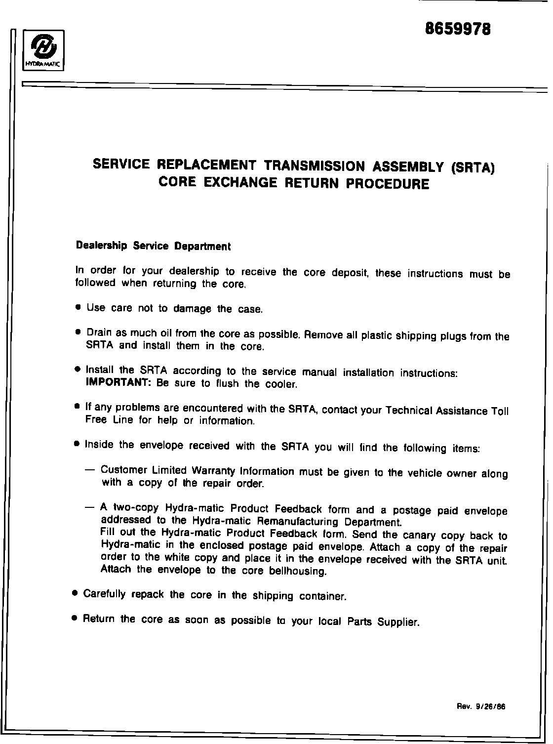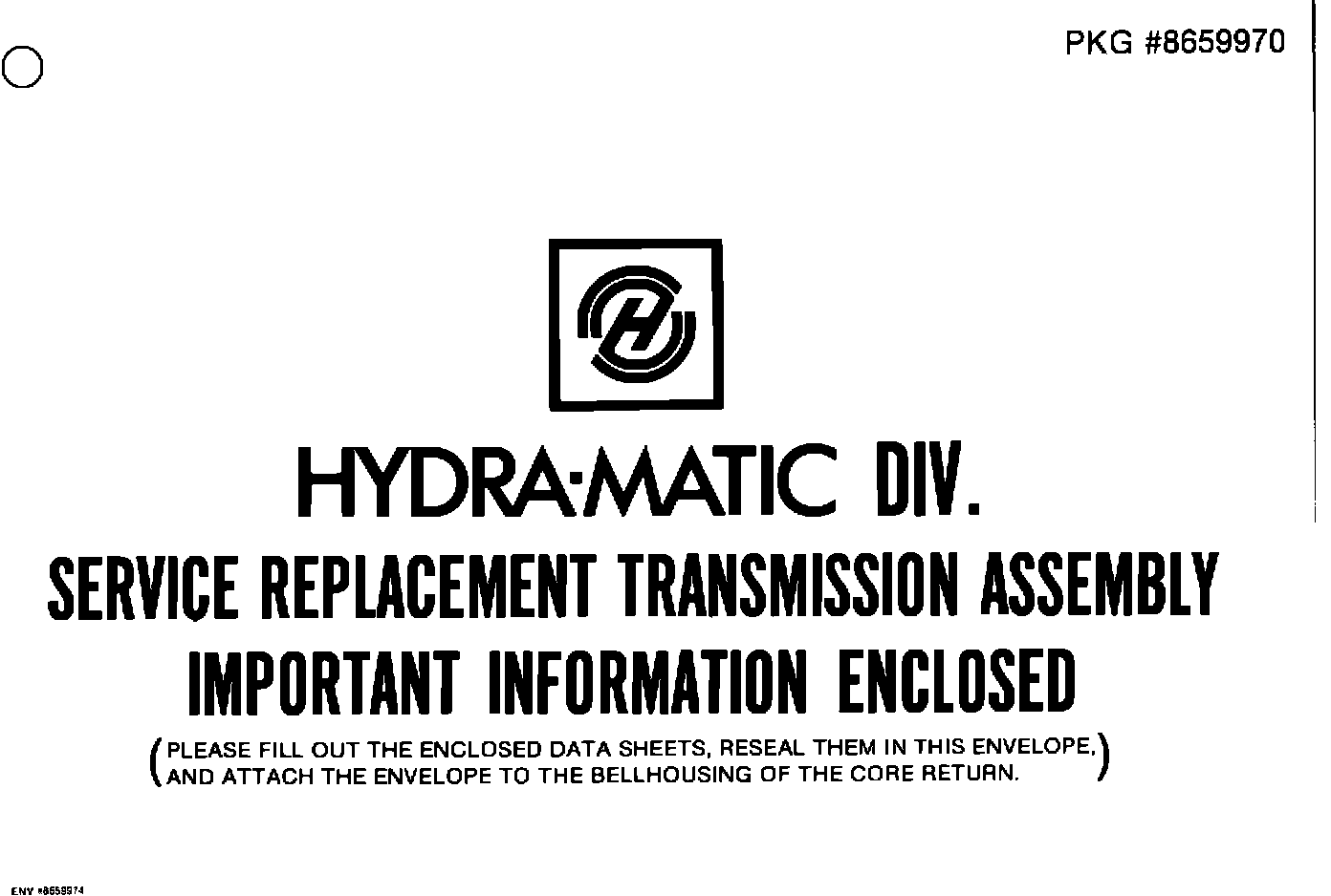 Each SRTA unit will be shipped in a container which must be used for core return of the original THM 125C assembly to your GMSPO Parts Distribution Center. A SRTA Information Packet is included with each SRTA unit. The contents of this envelope are to be removed and used as described with each illustration on the following pages.