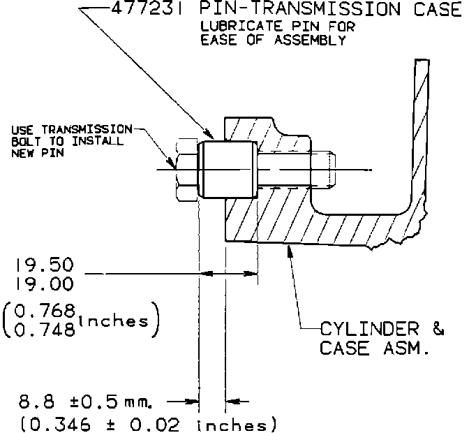 A. Both 15.0 mm (0.590") long transmission case dowel pins, located in the rear of the engine cylinder and case assembly should be removed and replaced with two 19.0 mm (0.748") long dowel pins, P/N 477231. Pin removal can be accomplished with the use of an "easy-out" and large tee handle or other similar method. Care should be exercised to avoid damage/deformation to the precision machined locating counterbores in the cylinder and case. Particular care should be taken to avoid cracking the cylinder and case. Install the pins to a depth that provides 8.8 mm (0.35") protrusion, as shown in Figure 1.