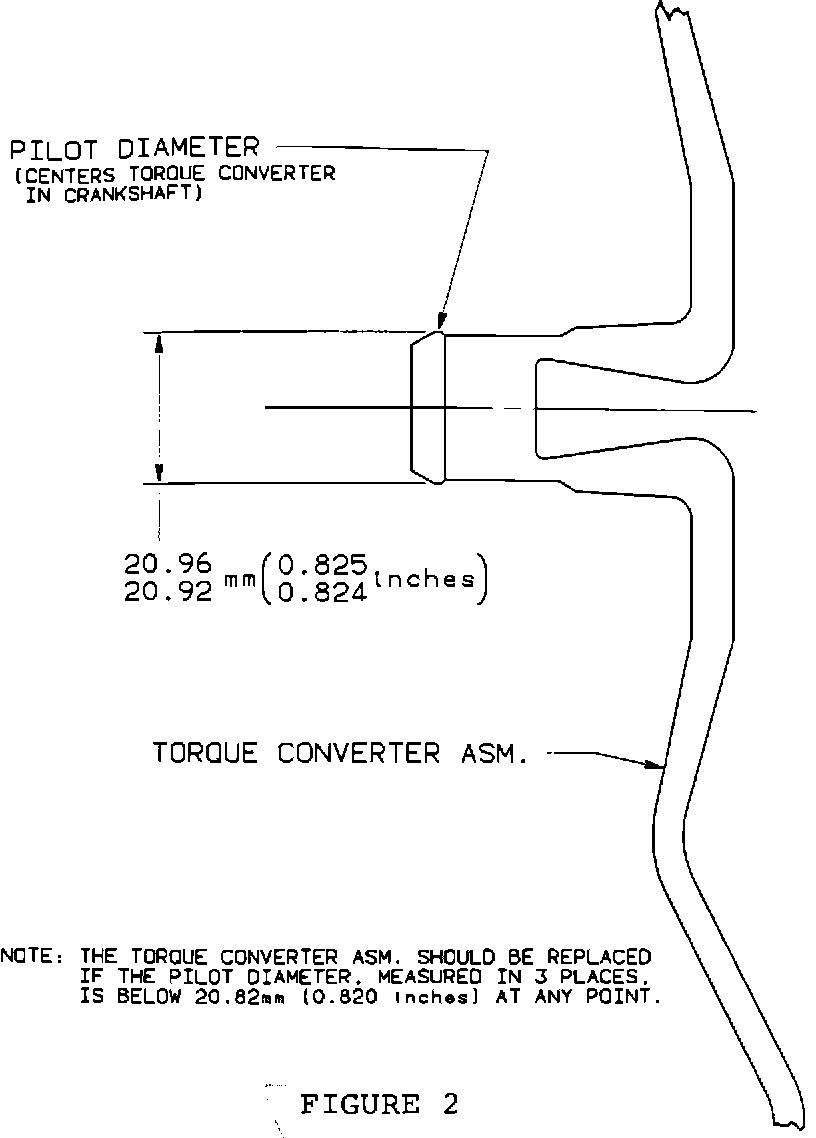 B. Inspect the torque converter pilot for wear. The amount of wear can be determined by measuring the outside pilot diameter at a minimum of three different places around the converter pilot, see Figure 2. If the diameter measures less than 20.82 mm (0.82") at any location, then torque converter pilot wear has occurred and converter replacement is required.