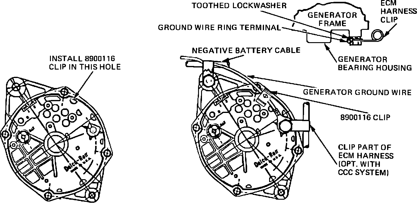 This condition can be corrected by securing the ground wire in a plastic clip (part number 8900116) and installing the clip in the specified hole on the back of the alternator.. See diagrams (shown below as well as on the reverse side).
