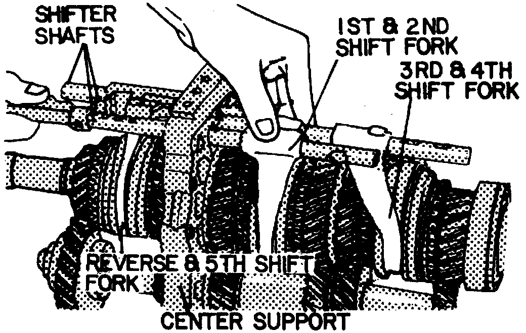 13. Remove shifter shaft from center support. Remove shift forks and interlock pins.