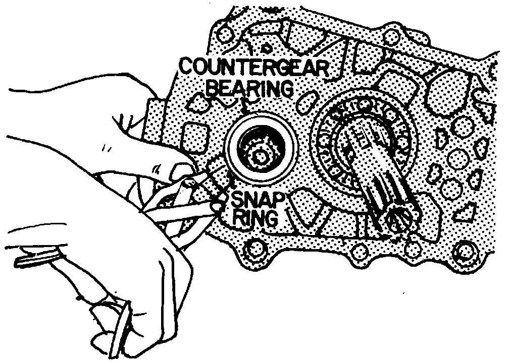 22. Remove countergear snap ring while gently tapping on front of center support. Remove mainshaft bearing snap ring and move mainshaft inward. Remove countergear and mainshaft.