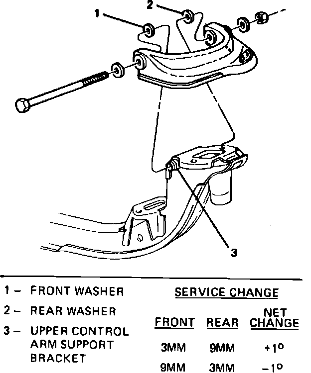 2. Camber may be increased approximately 1° by rotating 1/2 turn and reinstalling with flat of upper flange on inboard side of control arm, Fig. 1.