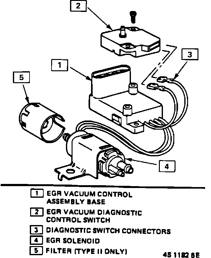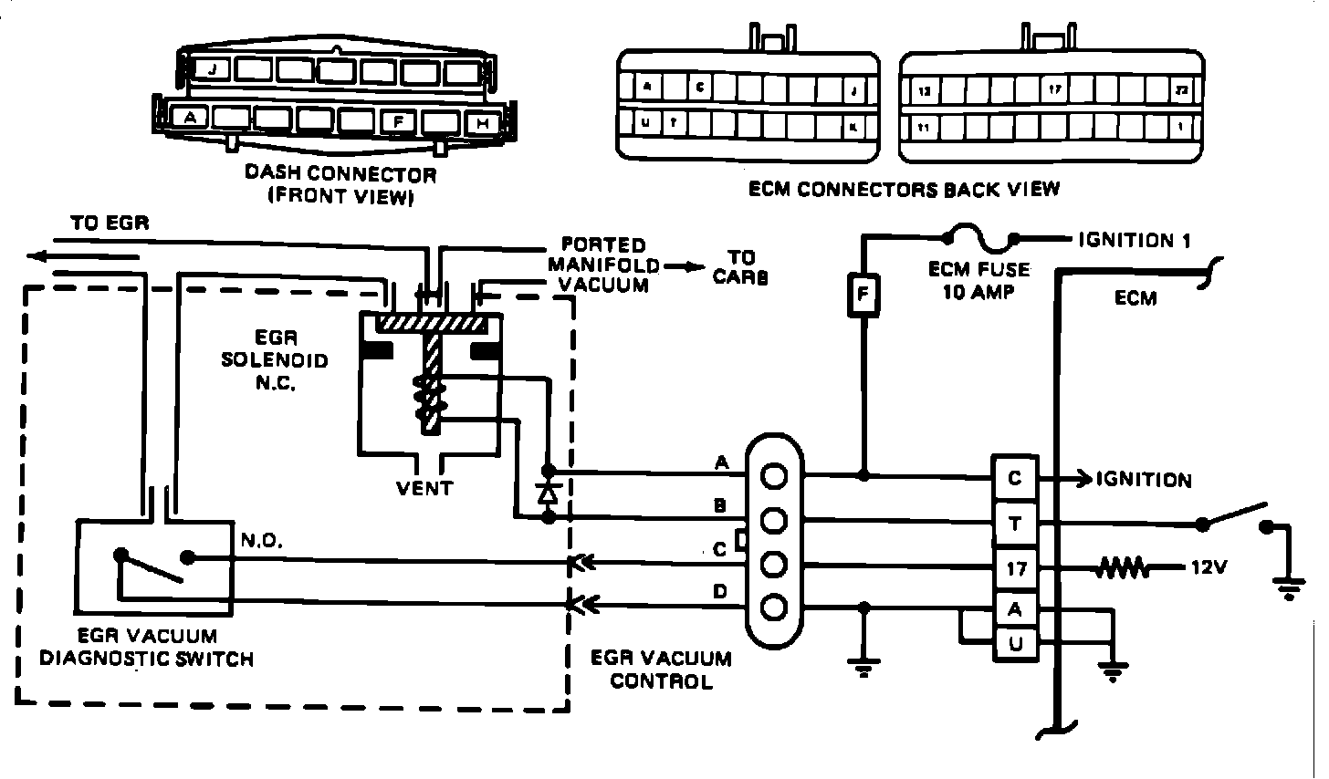 The EGR Vacuum Control is an ECM controlled solenoid that pulses ported manifold vacuum to the EGR valve. The ECM controls the EGR vacuum by completing the ground to energize a normally closed solenoid. The EGR is "pulse width modulated"; that is the ECM varies the amount of EGR by the amount of time the solenoid is "ON" or "OFF". Part of the control includes a Vacuum Diagnostic Control Switch. Its purpose is to signal the ECM when vacuum is actually being applied to the EGR valve. The EGR vacuum diagnostic control switch is serviced separately.
