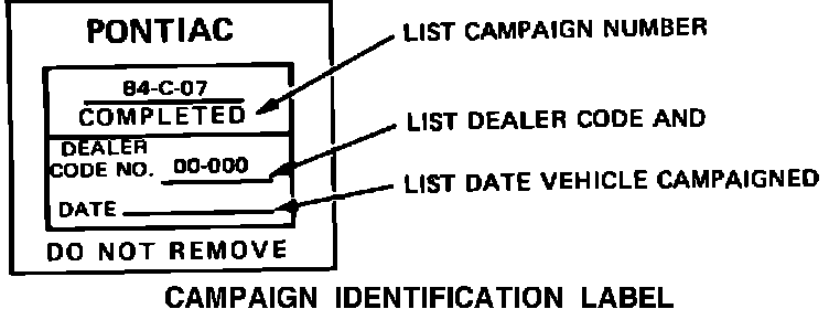 Each vehicle modified in accordance with the instructions outlined in this service procedure will require a campaign identification label. Each label provides a space to include the campaign number, the five-digit dealer code of the dealer performing the campaign service, and the date vehicle was campaigned. This information may be inserted with a typewriter or ballpoint pen. Install the label on the radiator baffle where it is readily visible. Close hood. (Additional campaign labels are available on stationery order as Form 7901-709.)