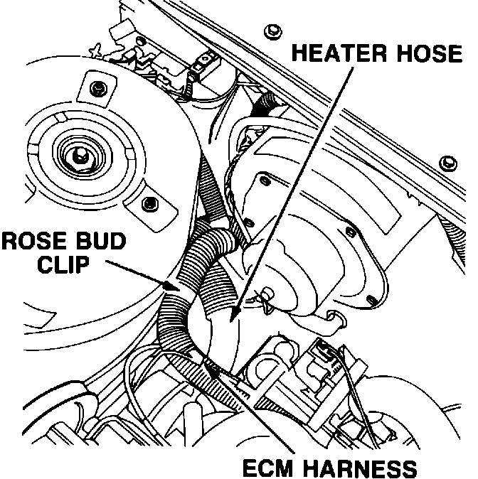 6. Disconnect the heater hose and route hose around the ECM wiring harness (capturing the harness in the loop of the hose).