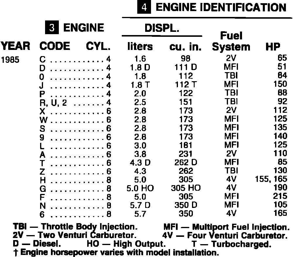 4 - ENGINE IDENTIFICATION: On the line where the engine code appears, read to the right to identify the engine.