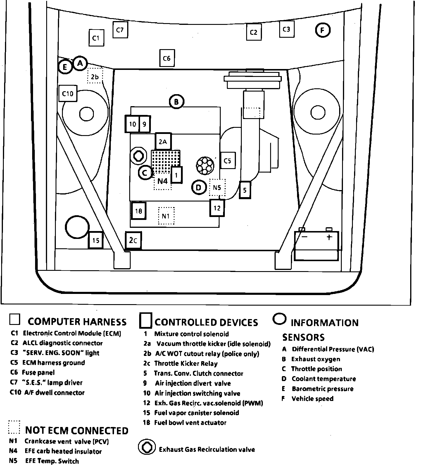 Fig. 67 Emission Component Location. W/V6-173/2.8L, 2 Bbl.: