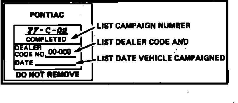 Each vehicle modified in accordance with the instructions outlined in this Product Campaign Bulletin will require a "Campaign Identification Label". Each label provides a space to include the campaign number, the five digit dealer code of the dealer performing the campaign service, and the date vehicle was campaigned. This information may be inserted with a typewriter or ballpoint pen. Install the label only on a clean, dry surface of the radiator baffle where it is readily visible. (Additional campaign labels are available on stationery order as. Form 7901-709).