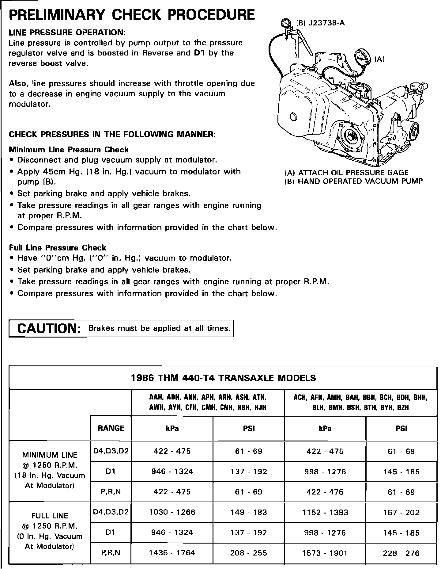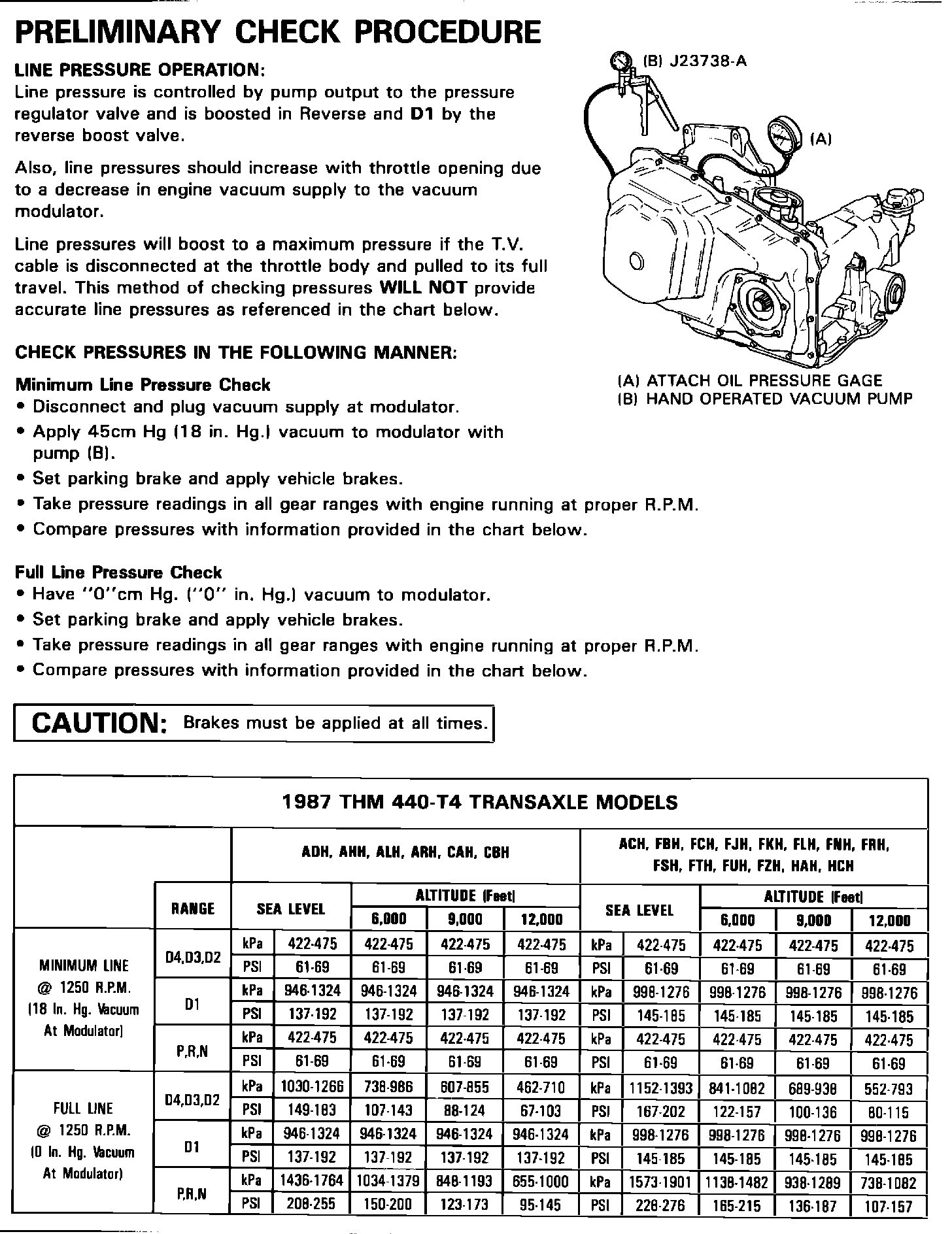 When checking line pressures on a THM 440-T4 transaxle it is important to follow the steps as described in the Preliminary Check Procedure in Figures 1 and 2. Using the T..V. cable to check maximum line pressures will not provide accurate readings.