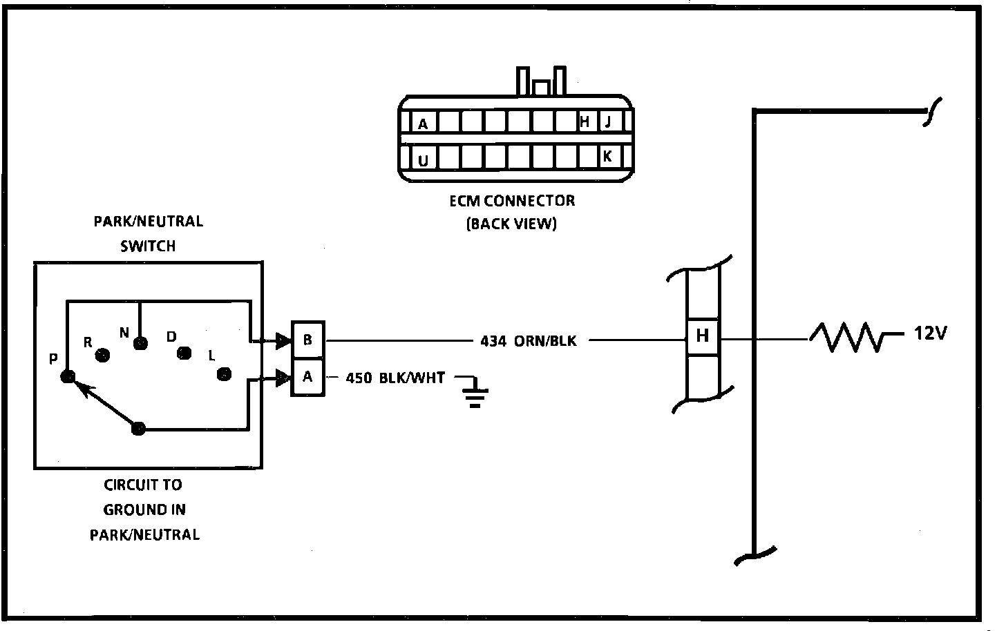 The P/N switch is connected to the transmission gear selector. The switch is closed when the gear selector is in Park or Neutral and open for all other ranges. One side of the switch is connected to the ECM which supplies a buffered 12 volts. The other side of the switch is connected to ground. The P/N switch is an input to the ECM. When the voltage at ECM Terminal "H" is high (12 volts), the ECM allows activation, at the proper time, of other controls such as TCC, EST, VSS, ISC and others.