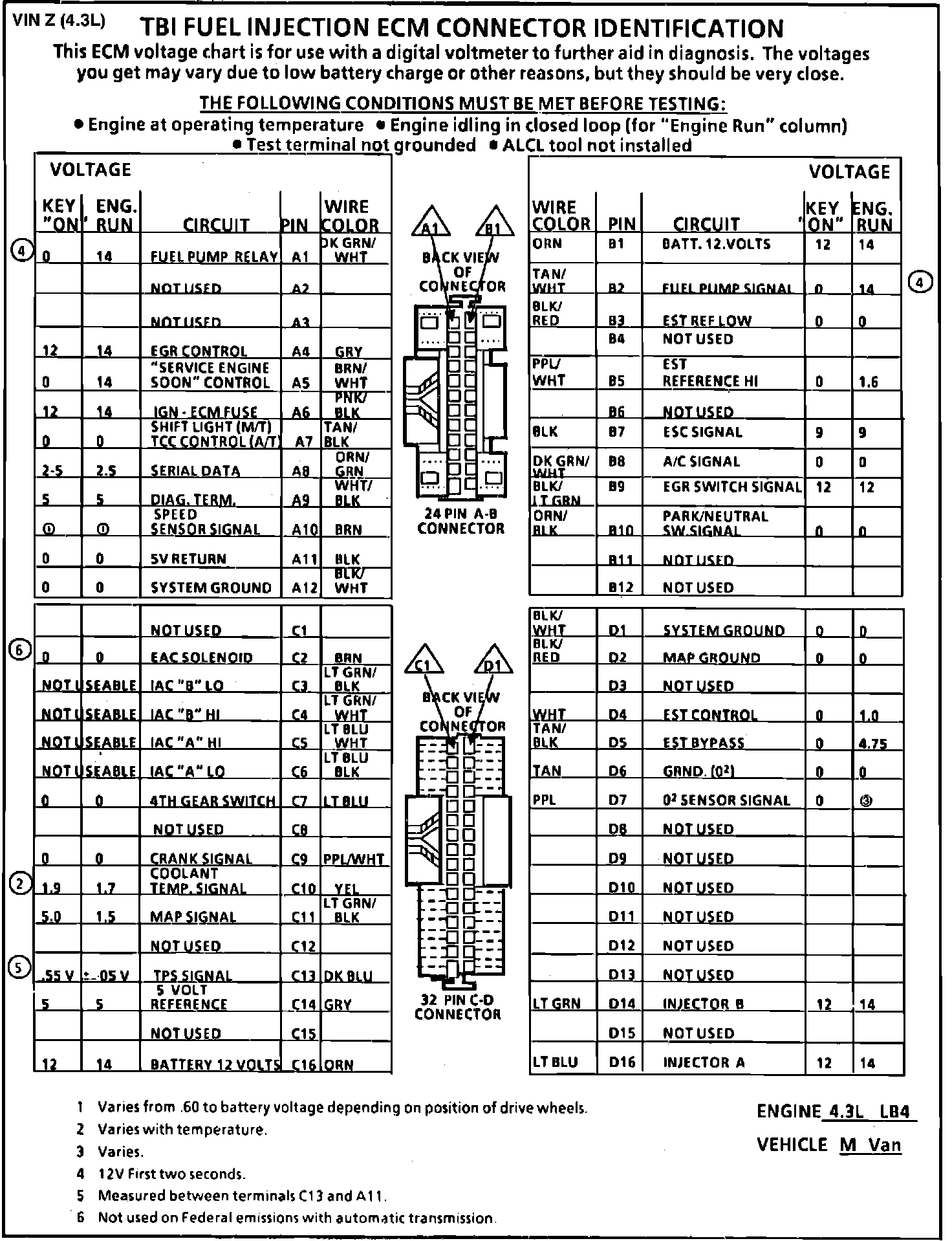 Fig. 009 ECM Connector Terminal I.D. & Volt. Specifications:
