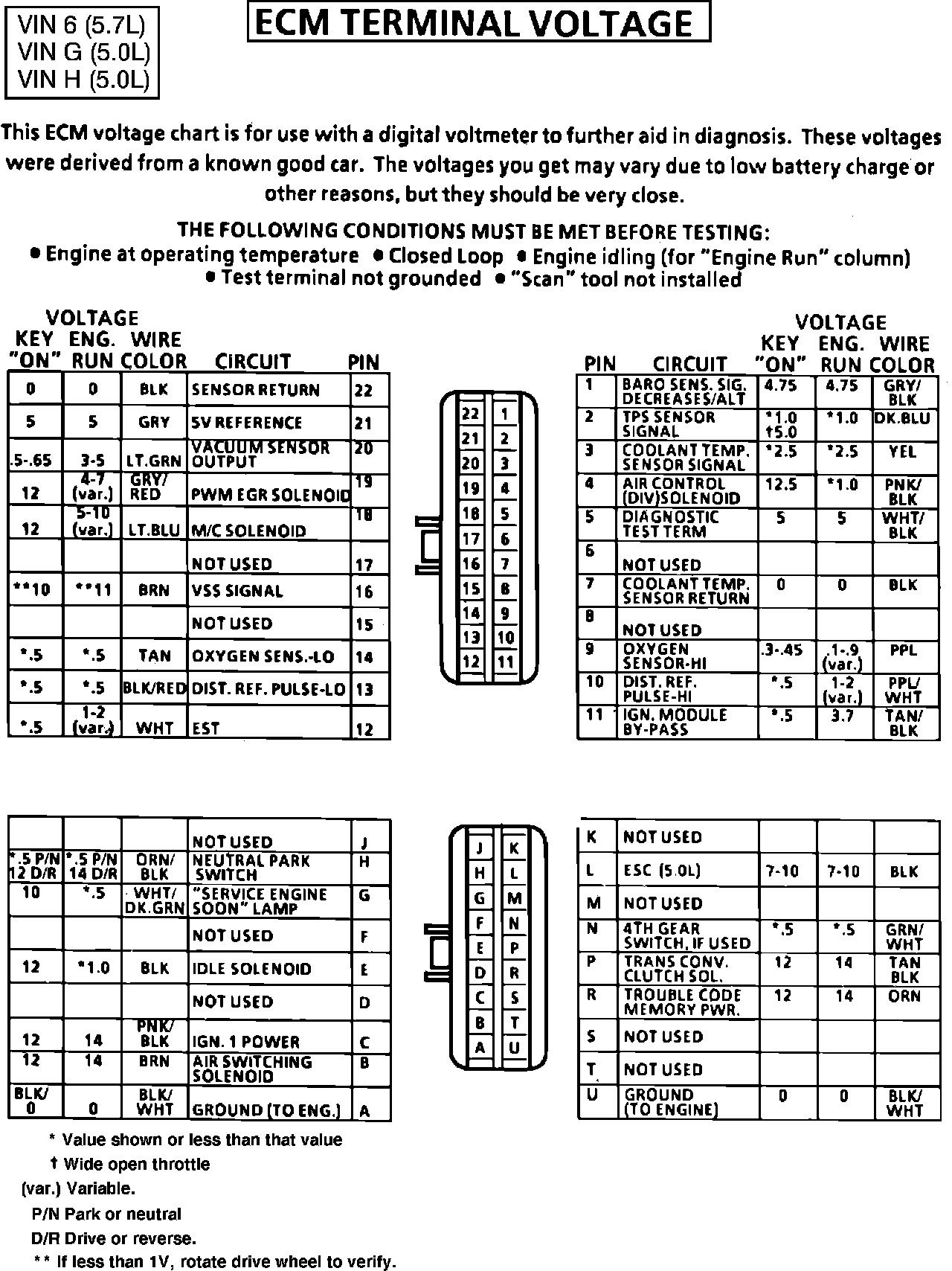 Fig. 045 - ECM Connector Terminal Identification & Voltage Specifications.: