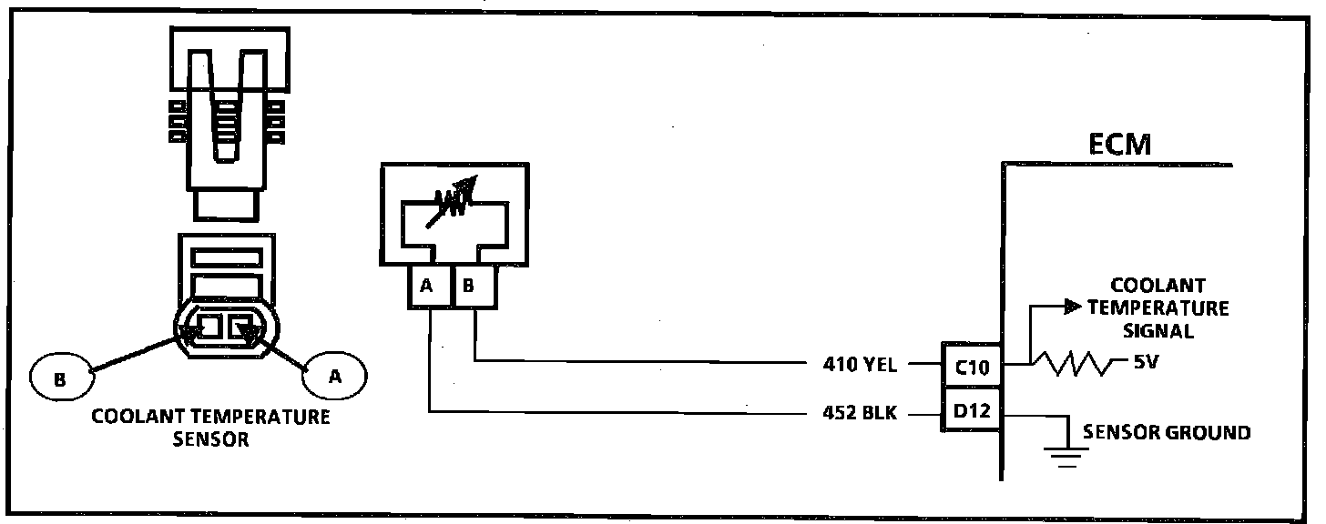 The coolant temperature sensor uses a thermistor to control the signal voltage to the Electronic Control Module (ECM). The ECM applies a voltage on CKT 410 to the sensor. When the engine is cold the sensor (thermistor) resistance is high, therefore the ECM will see high signal voltage.
