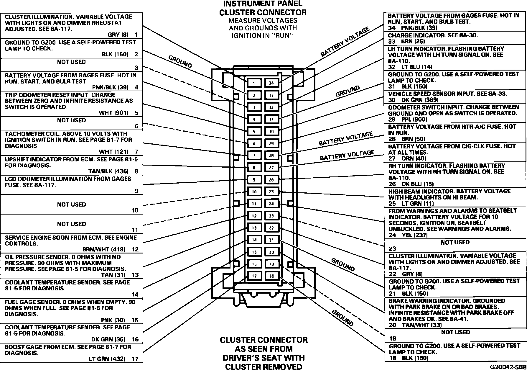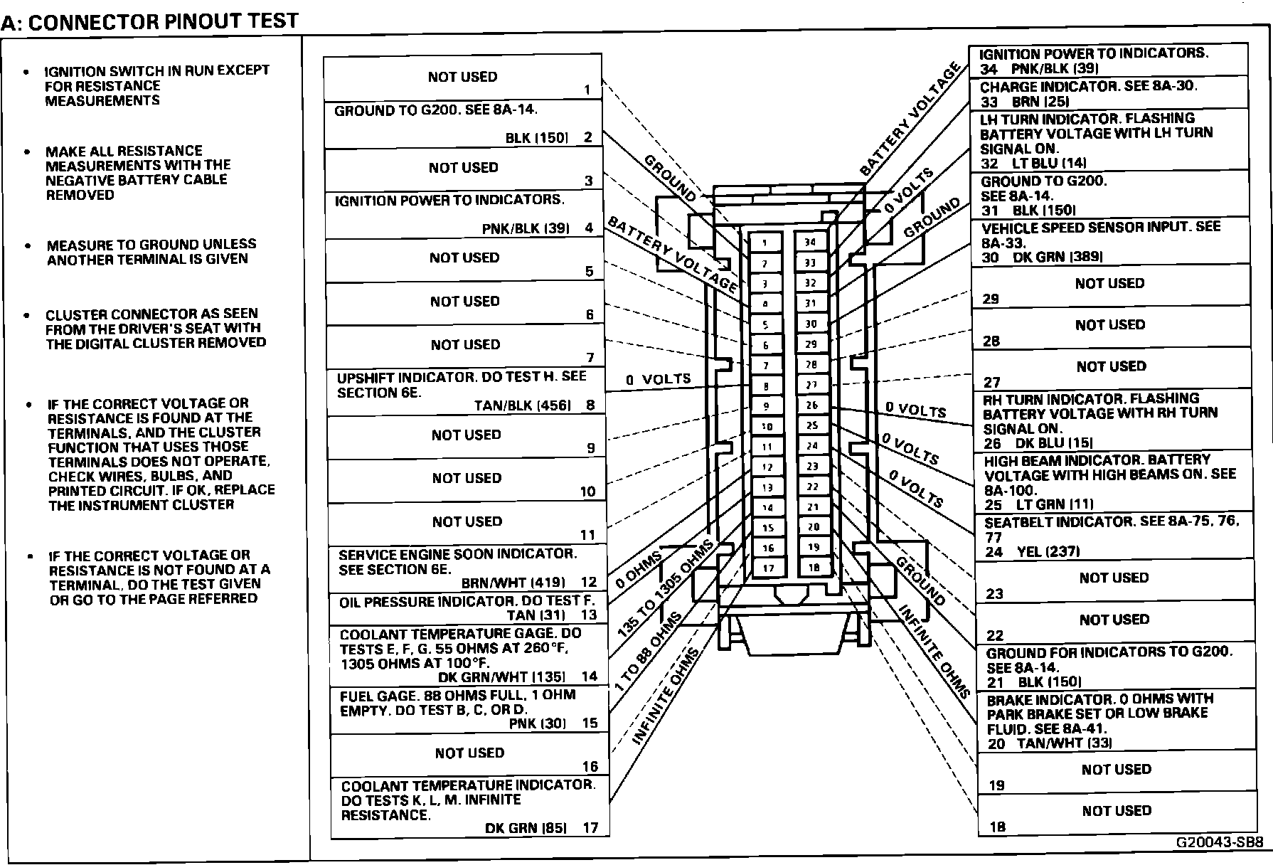 Pages 8A-80-4 and 8A-81-4 of the 1986 Grand Am Service Manual are incorrect. The pictures indicate that as seen from the drivers seat, terminals #17 and #18 are located at the top of the connector. This is incorrect. Terminals #1 and #34 are located at the top of the connectors. See Figure 1 for the indicators cluster and Figure 2 for the gauge cluster. This has been corrected for the 1987 Grand Am Service Manual.