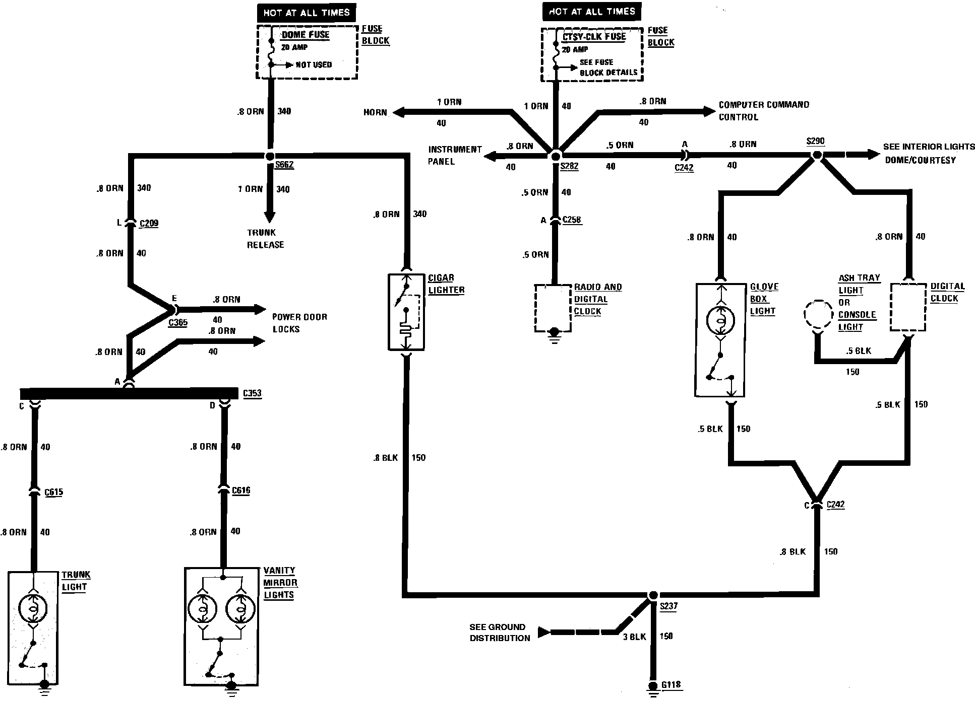 Cigar Lighter, Digital Clock, Glove Box Lamp, Trunk Lamp & Vanity Lamps Wiring Circuit: