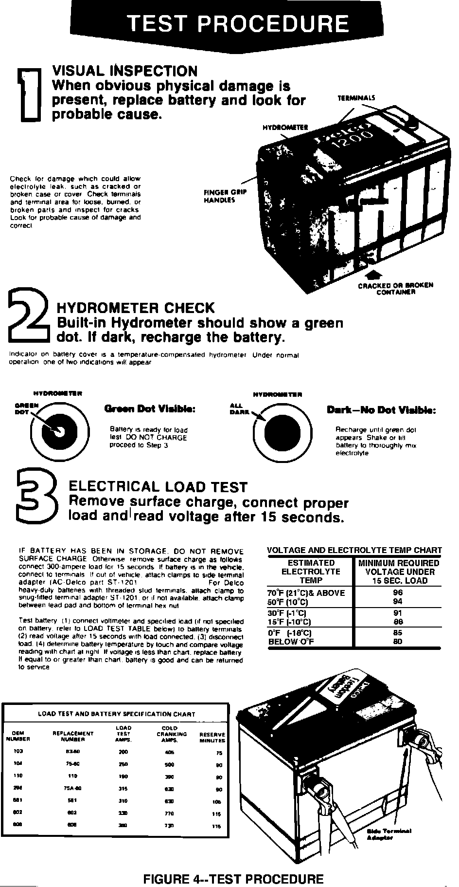 4. Temperature of the battery will change the minimum voltage to pass the load test. To properly determine minimum voltage, estimate temperature battery has been exposed to for the last several hours, i.e., room temperature or outside ambient to within 10 degrees Fahrenheit. If voltage is equal to or above minimum voltage listed in the appropriate Service Manual, Section 6D, the battery is good and should be returned to service. If voltage is less than minimum requirement, replace battery.