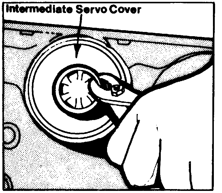4. Compress intermediate servo cover using tool J-29714 or equivalent, remove retaining ring, see first image, then remove cover and seal ring, see second image, with suitable pliers.