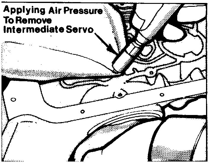5. Remove intermediate servo piston and band apply pin, see first image. If intermediate servo cover and seal assembly cannot be removed, place a shop cloth and hand over cover and case, then apply compressed air into direct clutch accumulator port, see second image.